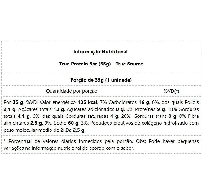 True Protein Bar (35g) A True Bar Protein da True Source é perfeita para quem busca aliar saúde e sabor. Com um sabor inesquecível, ela é formulada com 2,5g de colágeno Verisol na porção diária, contribuindo para a beleza da pele e a saúde das articulações. Além disso, não possui açúcares adicionados nem corantes artificiais, garantindo uma escolha mais natural e saudável. Inclua a True Bar Protein na sua rotina e experimente o equilíbrio ideal entre prazer e bem-estar! Benefícios: * 2,5g de Verisol;* 9g de proteínas;* Firmeza e elasticidade da pele;* Suporte às articulações;* Sabor inesquecível.