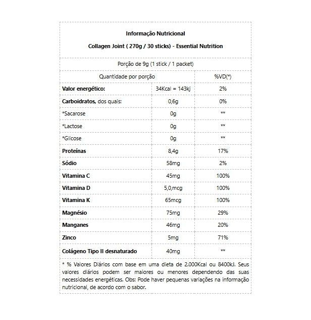 COLLAGEN 2 JOINT (30 Sticks) Conheça mais este produto na linha de colágeno Essential. Collagen 2 Joint é uma solução única, que combina os colágenos tipo I e II, vitaminas C, D e K, e também os minerais magnésio, manganês e zinco. Uma fórmula muito bem articulada, com ingredientes e matérias-primas escolhidas a dedo. Tudo isso com sabores de impacto para você provar e aprovar: limão-siciliano e neutro. --* CONHEÇA SEUS COMPONENTES: ** PEPTÍDEOS BIOATIVOS DE COLÁGENO: Os peptídeos de colágeno tipo I Peptan® da Rousselot – marca líder mundial – são altamente digeríveis e facilmente absorvidos (taxa de absorção superior a 90%). Os peptídeos de colágeno Peptan® são estruturas de tamanho extremamente reduzido obtidas a partir do colágeno hidrolisado que apresentam solubilidade e absorção potencializadas. O colágeno é o maior constituinte do tecido conectivo, como cartilagens, tendões, pele e ossos. É um suporte nutricional para os atletas, idosos e público em geral. **COLÁGENO TIPO II: É o colágeno não-desnaturado e não-hidrolisado, ou seja, com sua estrutura intacta necessária à sua atividade no organismo. As cartilagens são formadas basicamente por proteoglicanos (macromoléculas responsáveis pela regulação da hidratação) e colágeno tipo II (proteína estrutural responsável pela tração e firmeza do tecido cartilaginoso). A expressão do colágeno tipo II está relacionada à presença de colágeno tipo I. ** VITAMINAS C, D E K2: O Collagen 2 Joint possui 100% da Ingestão Diária Recomendada (IDR) das vitaminas C, D e K. Essas vitaminas estão envolvidas em importantes funções fisiológicas do corpo. A presença de vitamina K2-MK7, conhecida como menaquinona, proporciona ação prolongada dessa vitamina no organismo e elevada biodisponibilidade. A vitamina D presente no Collagen 2 Joint é o colecalciferol (D3), forma ativa prontamente biodisponível. ** MINERAIS BIODISPONÍVEIS: MAGNÉSIO, MANGANÊS E ZINCO São minerais quelados envolvidos por aminoácidos que otimizam sua absorção pelo organismo. Essa característica torna o produto mais tolerável e biodisponível. Os minerais presentes no Collagen 2 Joint são altamente qualificados e provenientes da empresa pioneira no desenvolvimento de nutrição mineral. Assim como as vitaminas, o magnésio, manganês e zinco também têm papel importante no funcionamento do organismo. ** ADOÇANTES NATURAIS: Os adoçantes utilizados nos suplementos Essential Nutrition são obtidos de fontes naturais NON-GMO (não geneticamente modificados), apresentam zero ou baixo índice glicêmico, não deixam sabor residual e podem ser utilizados por gestantes, crianças e pacientes com diabetes. BENEFÍCIOS: * Colágeno tipo II não desnaturado;* Peptídeos de colágeno tipo I Peptan®;* Rico em Vitamina K2;* Rico em vitamina C e D3;* Rico em minerais biodisponíveis (magnésio, zinco e manganês);* Adoçante natural NON-GMO – Estévia;