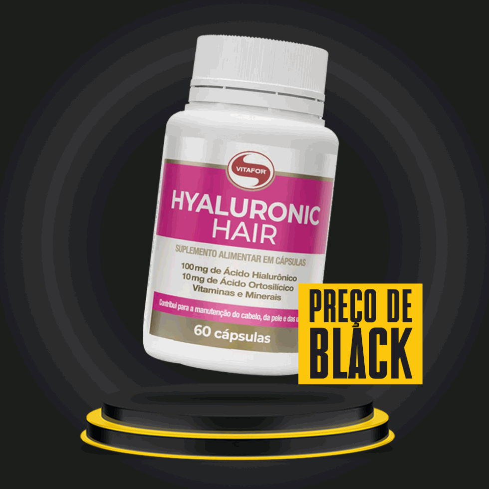 Hialuronic Hair (60 caps) HYALURONIC HAIR é um suplemento alimentar à base de ácido hialurônico, vitaminas, minerais e óleo de semente de uva (Vitis vinífera L.). Dados Científicos Além da alimentação, a suplementação pode ser uma aliada quando o assunto é saúde da pele, de cabelos e unhas, principalmente nos dias atuais, com rotinas cada vez mais corridas. Para cuidar dos fios, micronutrientes como vitaminas e minerais são fundamentais, pois desempenham um papel importante no desenvolvimento normal do folículo capilar1. E, de acordo com a literatura disponível, a nutrição impacta na saúde capilar em todo o processo de crescimento e manutenção das células dos folículos pilosos. Dito isso, a prescrição de nutrientes é importante para a manutenção da saúde dos cabelos2. Se parece difícil manter as unhas fortes e em crescimento constante, a suplementação de vitaminas e minerais, incluindo biotina, zinco e cobre, também pode auxiliar, já que demonstrou um impacto positivo no crescimento das unhas3. Já quando se trata de pele, é indicado ter uma rotina de cuidados também de dentro para fora. O ácido hialurônico se mostra um ótimo aliado e sua suplementação pode promover a hidratação da pele, aumentar o seu brilho, diminuir o amarelecimento e proporcionar aumento da espessura da epiderme4. Benefícios: - O zinco contribui para a manutenção do cabelo, da pele e das unhas;- A biotina contribui para a manutenção do cabelo e da pele;- A vitamina A e a niacina (vitamina B3) contribuem para a manutenção da pele;- O Cobre contribui para a pigmentação de cabelo e pele. Diferenciais: * 100mg de ácido hialurônico por porção (2 cápsulas); * Possui vitaminas e minerais; * Contém óleo de semente de uva. * Praticidade no formato em cápsulas.