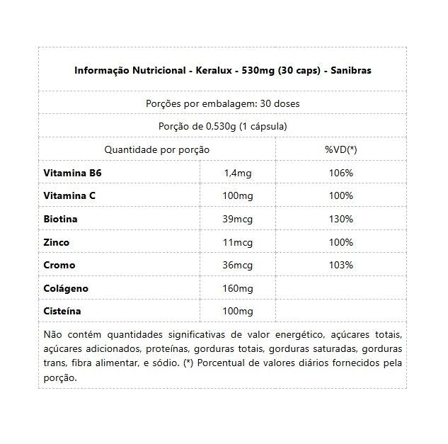 Keralux - 530mg (30 caps) - SANIBRAS Keralux, fios fortes com somente uma cápsula ao dia. 85% do nosso cabelo é queratina, e a sua falta resulta em cabelos secos e com queda acentuada.- CONHEÇA ABAIXO OS SEUS COMPONENTES:Vitamina B6: Ajuda na produção de queratina, proteína que forma a estrutura do cabelo e da barba.Vitamina C: É um antioxidante que ajuda a proteger os fios contra danos.Biotina: É essencial para a produção de queratina e para a saúde dos folículos capilares.Zinco: Ajuda a manter a saúde dos folículos capilares e a prevenir a queda de cabelo.Cromo: Ajuda a regular os níveis de açúcar no sangue, o que pode ser benéfico para a saúde do cabelo e da barba.Colágeno: É a proteína mais abundante no corpo e é essencial para a saúde do cabelo e da barba.Cisteína: É um aminoácido que é essencial para a produção de colágeno.