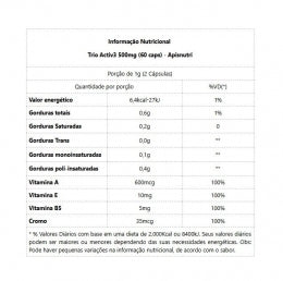 TRIO ACTIV3 500mg (60 caps) - APISNUTRI Com ativos que complementam a alimentação, o Trio Activ3 da Apisnutri, possui Óleos de Cártamo, Girassol e Semente de Uva em sua composição, além de cafeína, Vitaminas B5, E e A, Picolinato de Cromo e Lecitina de Soja. Seu consumo auxilia no emagrecimento e queima de gordura, além de gerar energia e disposição para o dia a dia. BENEFÍCIOS * Diminuição da gordura localizada; * Sensação de saciedade e diminuição do apetite; * Aumento da imunidade; * Ação antioxidante; * Ajuda o sistema cardiovascular; * Diminui o colesterol ruim. Embalagem disponível: frasco contendo 60 cápsulas.