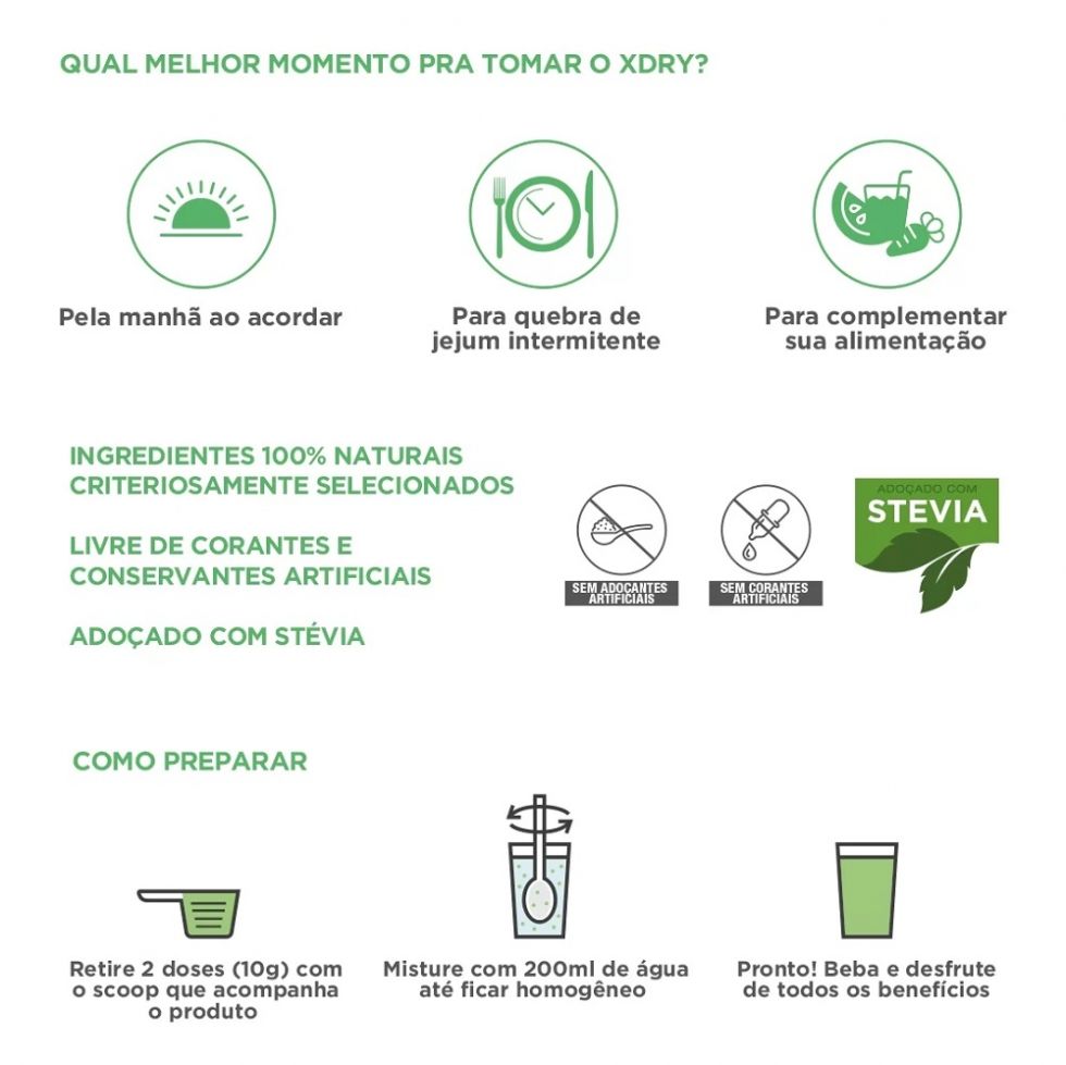 X-Dry (200g) - NUTRATA X Dry é um composto em pó para preparo de suco antioxidante. À base de couve, polpa de maçã, limão, gengibre, cúrcuma, alecrim e hortelã, com vitaminas e minerais para fazer parte do seu dia a dia de forma rápida e saborosa. Possui uma fórmula exclusiva com ingredientes naturais que contribui para uma vida mais saudável. X Dry é adoçado com Stévia, sem adoçantes artificiais e sem corantes artificiais Benefícios: - VITAMINA A – Contribui para a manutenção da pele;- VITAMINAS C e E – São antioxidantes que auxiliam na proteção dos danos causados pelos radicais livres; A vitamina C auxilia no metabolismo energético e no metabolismo de proteínas e gorduras;- BIOTINA – Auxilia no metabolismo energético; contribui para a manutenção do cabelo e da pele;- SELÊNIO e ZINCO – Antioxidantes que auxiliam na proteção dos danos causados pelos radicais livres. O zinco contribui para a manutenção do cabelo, da pele e das unhas.