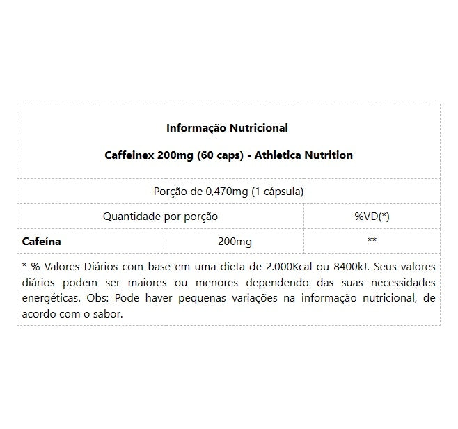 Caffeinex 200mg (60 caps) CAFFEINEX da Atlhetica Evolution Series é um suplemento de cafeína para atletas composto pela exclusiva MICROCAPS TECH, cafeína micro encapsulada que garante a liberação imediata e gradativa da cafeína anidra, capaz de aumentar a resistência aeróbica em exercícios físicos de longa duração. Caffeinex é o único suplemento de cafeína para atletas fabricado com cafeína anidra obtida por processo tecnológico de isolamento e purificação (teor 99,5% de 1,3,7 - trimetilxantina) e com Microcaps Tech (Microencapsulada de liberação gradual) tornando-o um produto de liberação de energia imediata e, ao mesmo tempo, gradual para atletas de alta performance. BENEFÍCIOS:* Melhora o desempenho físico;* Aumenta a disposição física e a atenção;* Aumenta a oferta de energia ao organismo;* Microcaps Tech (Cafeína Microencapsulada);* Liberação Imediata e Gradativa de Cafeína.