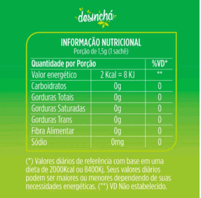 Desinchá (60 sachês)     Desinchá, o chá número 1 do Brasil e o primeiro hábito saudável do seu dia. Chá desenvolvido por Nutricionistas!    Foi desenvolvido ao longo de 2 anos com o auxílio de nutricionistas, pesquisas científicas e vários testes até chegar em uma fórmula eficaz e deliciosa. O Desinchá é composto por chá verde, carqueja, chá mate, hortelã, gengibre, guaraná, sálvia e alecrim. A caixa vem com 60 sachês, para que você tome todo dia por 2 meses. Consumir um sachê por dia já é suficiente para ter os benefícios do Desinchá. Conheça suas propriedades:* Chá verde: Acelera o metabolismo;* Carqueja: Atua na boa digestão do organismo e controle do apetite;* Chá Mate verde: Ajuda a queimar mais calorias;* Guaraná: Favorece a perda de peso e melhora o humor;* Hortelã: Ajuda a aliviar sintomas da asma e outros problemas respiratórios;* Gengibre: Acaba com o inchaço e acelera o metabolismo;* Sálvia: Atua como desintoxicante no organismo;* Alecrim: Regula o intestino;  Benefícios: * Diminui retenção líquida corporal;* Favorece a perda de peso;* Acelerador de metabolismo;* Emagrecedor eficaz;* Efeito antioxidante.