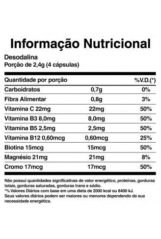 DESODALINA (60 caps) – SANIBRAS Composto emagrecedor formulado com algumas matrizes que aceleram o metabolismo, garantem maior queima da gordura, com bloqueador de gordura, inibem o apetite, e ainda possui riqueza em antioxidantes que produzem grande ação antioxidante dos radicais livres no organismo, como a vitamina C, vitamina B3, B7 e magnésio. CONHEÇA OS SEUS COMPONENTES: * Polpa de Laranja Desidratada: Efeito termogênico e diurético. Transforma gordura em energia;* Quitosana: Impede que a gordura ingerida seja absorvida;* Psillium: Fibra solúvel, garante melhor fluxo intestinal;* Cafeína: Componente acelerador de metabolismo, garante mais energia e maior queima de gordura;* Óxido de Magnésio: Evita concentrações acidas no ambiente estomacal;* Vitamina C: Protetor celular, garante ação antioxidante de radicais livres;* Vitamina B3: Atua na absorção de vários componentes do organismo; * Vitamina B5: Essencial no metabolismo de carboidratos, proteínas e lipídios;* Clorella em Pó: Fibra solúvel, garante que gordura ingerida não seja absorvida;* Picolinato de Cromo: Mineral que além de controlar a glicemia, controla o apetite e a vontade por alimentos doces e gordurosos; * Vitamina B7: Garante integridade e manutenção dos tecidos da pele.