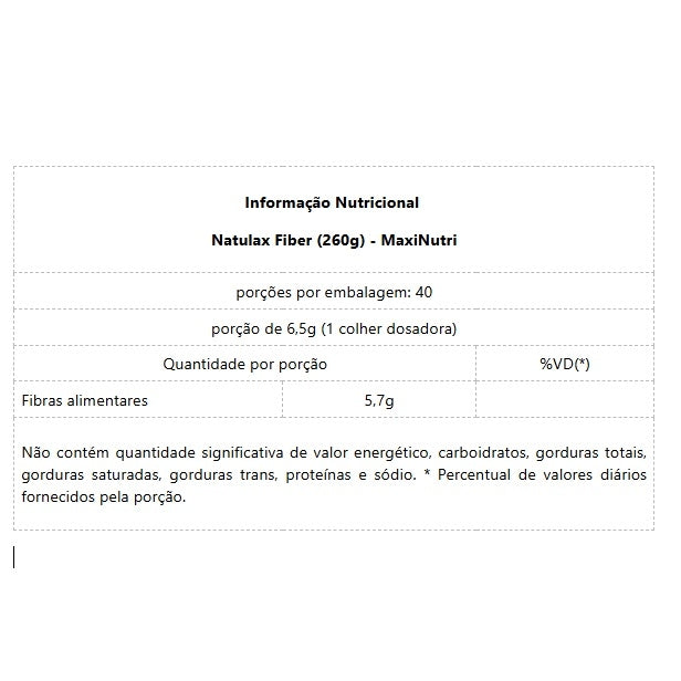 Natulax Fiber (260g) Experimente o poder da natureza com Natulax, o suplemento alimentar revolucionário projetado para promover uma digestão saudável e equilibrada. Combinando um mix cuidadosamente selecionado de 6 fibras solúveis e insolúveis, Natulax oferece uma solução completa para as suas necessidades de saúde digestiva. Benefícios: - Dissolve completamente;- Fonte de fibras zero açúcar;- Rende 40 porções;- Auxilia no funcionamento do intestino;- Acompanha colher dosadora.