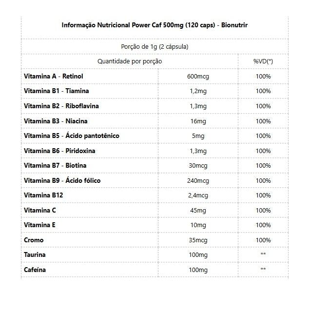 Power Caf 500mg (120 caps) - Bionutrir A cafeína em cápsulas, também conhecida como cafeína anidra, é um suplemento alimentar que serve como estimulante cerebral, podendo ser usado para melhorar o desempenho durante estudos e trabalho, além de também poder ser indicado para pessoas que praticam atividades físicas intensas como atletas e também por quem deseja emagrecer, pois acelera o metabolismo, favorece a queima de gordura e melhora a disposição. As cápsulas de cafeína são produzidas através da extração da cafeína dos alimentos por meio de um processo de desidratação e purificação, o que a torna a cafeína em cápsulas mais concentrada e, portanto, mais potente do que a cafeína normal. Além disso, ao ser ingerida, a cafeína anidra é absorvida rapidamente pelo intestino, iniciando seus efeitos estimulante. Além da cafeína, o Power Caf da Bionutrir possui as principais vitaminas, tais elas, as vitaminas A, B1, B2, B3, B5, B6, B7, B9, B12, C e E para melhor funcionamento do seu organismo. Benefícios: * Melhorar a atenção e a concentração;* Melhorar a memória e a capacidade de aprendizado;* Aumentar a força e a resistência muscular;* Aumentar o desempenho da atividade física;* Diminuir o cansaço e o sono;* Melhorar o humor;* Estimular a disposição e o bem-estar;* Melhorar o raciocínio e a velocidade processamento da informação;* Melhorar a respiração;* Diminuir a dor de cabeça;* Reduzir a percepção de dor.