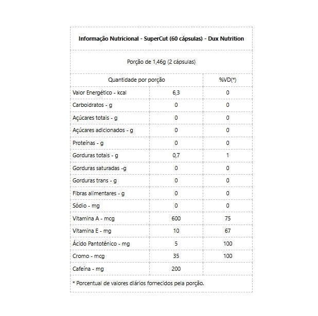 SUPERCUT ORIGINAL (60 caps) - DUX NUTRITION        Supercut é um termogênico à base de cafeína anidra, sem nenhuma superdosagem ou ingredientes ultrapassados, como é comum de se encontrar no mercado. Desenvolvido para aumentar a energia, acelerar o metabolismo basal, aumentar a utilização de gordura como energia, controlar o apetite e estabilizar os níveis de glicose no sangue.   BENEFÍCIOS: * Desenvolvido para dar mais energia, aumentar a queima de gordura e diminuir o apetite durante o dia todo;* Cientificamente projetado para acelerar a busca pela melhor forma, preservar a musculatura e construir o físico ideal;* Ativação Metabólica: os Supernutrientes ativos da fórmula elevam naturalmente a taxa de metabolismo basal, fazendo com que o organismo trabalhe a todo vapor;* Aumenta a termogênese;* Ação dos Minerais: o Picolinato de Cromo auxilia a regulação da insulina e a estabilização dos níveis de glicose no sangue.   Embalagem disponível: pote contendo 60 cápsulas de suplemento na forma de pó.