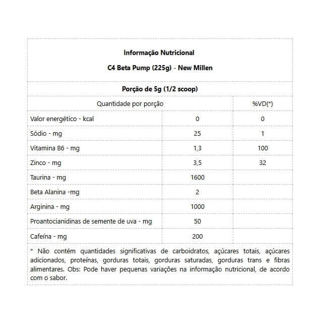 C4 Beta Pump (225g) O C4 Beta Pump é um pré-treino altamente concentrado e que prepara seu organismo para um trabalho intenso e desgastante. A suplementação de beta-alanina é efetiva no aumento da concentração de carnosina no músculo, aumentando pH e retardando a fadiga. Além disso possui a Vitamina B6, que auxilia no funcionamento do seu organismo. Altamente concentrado, O C4 Beta Pump prepara o organismo do atleta para um trabalho intenso de desgaste. Ele apresenta, em sua fórmula, cafeína e outras substâncias com grande poder estimulante e energético, o que o torna o pré-treino mais poderoso do mercado. Além disso, O C4 Beta Pump foi escolhido na categoria nacional como melhor pré-treino do mercado, dessa forma ganhando o Prêmio Suplementação 2018. A New Millen foi escolhida, com o C4 Beta Pump, como a melhor opção do mercado nacional na categoria pré-treino pela terceira vez. O Prêmio Suplementação 2018 contou com 11 categorias, que foram decididas pelo voto popular e apresentadas na feira Brasil Trading Fitness Fair, em São Paulo. Benefícios: - Suplemento Pré-Treino em Pó;- Mais Energia e Disposição;- Fórmula Extra Pump (Ação Vasodilatadora);- 200mg de Cafeína por Porção;- Zero Glúten;- Aumenta o volume muscular.