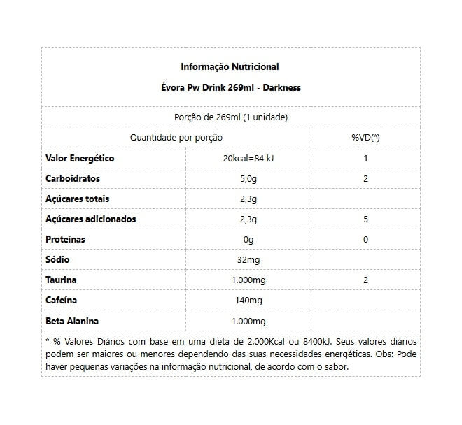 ÉVORA PW DRINK (269ml) - DARKNESS Redução da fadiga muscular, treinos intensos! A combinação dos ativos da formula de Évora PW criam as condições físicas e mentais adequadas para a realização dos treinos mais intensos que você possa imaginar, retardando exponencialmente o desgaste físico... Évora contém beta-alanina, ingrediente fundamental para quem busca a melhora do desempenho na execução de exercícios de alta intensidade: - BETA-ALANINA Reduz significantemente a acidose muscular, a sensação de queimação durante a execução dos exercícios extenuantes e repetidos que causam fadiga, potencializando a performance durante a sessão de treinamento intenso. - TAURINA Aminoácido que tem atuação no sistema nervoso, executa uma função que se assemelha ao neurotransmissor GABA (inibitório de ansiedade), potencializando o foco e reduzindo a ansiedade em atletas de alta performance. - CAFEÍNA É o estimulante mais ingerido no mundo, responsável por potencializar o estado de alerta mental e o desempenho físico devido a sua ação no sistema nervoso central. A cafeína também atua diretamente no músculo, aumentando a força e retardando a fadiga muscular. - PALATINOSE Carboidrato de baixo índice glicêmico, considerado um grande gerador de energia nos períodos pré e intra-treino. Não provoca picos de glicose no sangue e entrega um fluxo de energia constante por longos períodos o que faz desse carboidrato um auxiliador eficiente na melhora do desempenho físico durante os treinos e redução da fadiga muscular (periférica e central) quando comparado com outros carboidratos. BENEFÍCIOS: - Energia extrema;- Melhora do foco;- Resistência muscular;- Redução da fadiga muscular;- Alta performance.