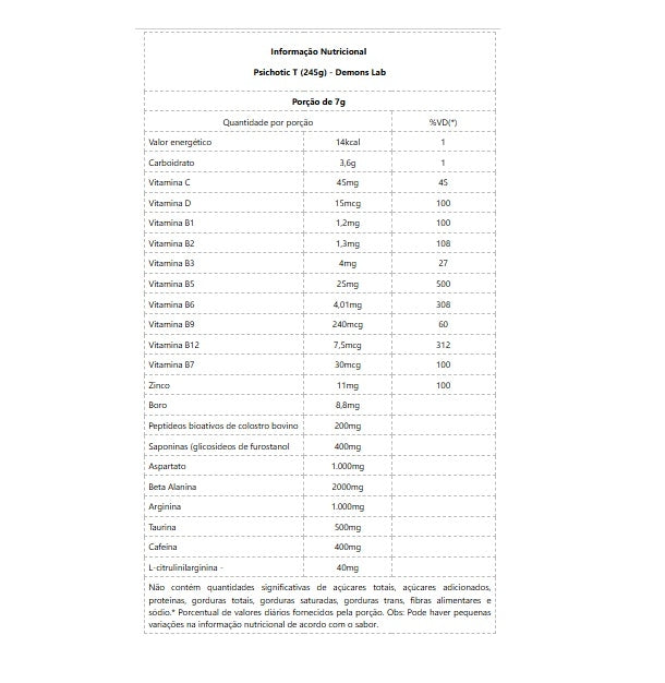 Psichotic T (245g) O Psichotic T foi desenvolvido com uma combinação de ingredientes-chave que auxiliam no suporte à saúde hormonal e ao equilíbrio natural de testosterona.Sua fórmula avançada contém 400 mg de Testofen®, um extrato patenteado que pode contribuir para o equilíbrio hormonal e o bem-estar geral.Com compostos que estimulam a adrenalina, o Psichotic T proporciona potência máxima, energia constante, resistência aprimorada e foco intenso. Além disso, ajuda na recuperação muscular e pode contribuir para a redução dos efeitos negativos do cortisol, promovendo um desempenho eficaz, tanto dentro quanto fora da academia. Benefícios: - 400mg de Testofen;- 2X Mais Energia;- Auxilia na Potência e Energia;- Melhora de Níveis de Cortisol;- Acelera o metabolismo;