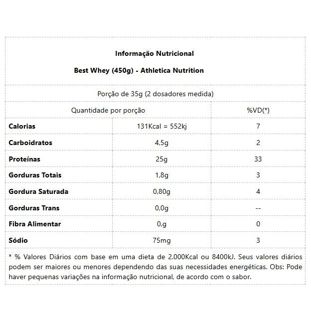 BEST WHEY (450g) - Athletica Nutrition Blend de Proteínas WPC, WPI e WPH, que oferece em cada porção 25 g de proteínas de alto valor biológico, em deliciosos sabores e perfeita cremosidade. ..* Conheça sobre suas proteínas: - PROTEÍNA ISOLADA: O Processo de obtenção do Whey Protein Isolate conta com uma sofisticada técnica de filtração por troca iônica, que quebra a estrutura das proteínas, deixando-o praticamente isento de gordura, lactose e colesterol. O produto acabado contém cerca de 90% de proteína. Contando com uma proteína pura e de rápida absorção. - PROTEÍNA CONCENTRADA: O Whey Protein Concentrado é obtido através de um processo de separação física (filtração), onde o produto acabado contém cerca de 80% de proteína mantendo sua estrutura intacta. Contém um teor reduzido de gordura e colesterol e, geralmente, um maior teor de compostos bioativos. Em virtude do seu elevado valor nutritivo e por não sofrerem alterações de ácidos no ambiente estomacal, são rapidamente digeridas e altamente absorvidos no intestino delgado. - PROTEÍNA HIDROLISADA: O processo de hidrólise consiste na quebra das moléculas de proteínas em peptídeos menores por processos químicos ou enzimáticos, o que torna a absorção mais fácil e completa pelo organismo. Possui alto valor biológico, além de uma alta pureza na qualidade da proteína. BENEFÍCIOS: * Rico em Whey protein isolado, concentrado e hidrolisado;* Aumento do ganho de massa muscular;* Acelera o metabolismo;* Rico em vitaminas e minerais.