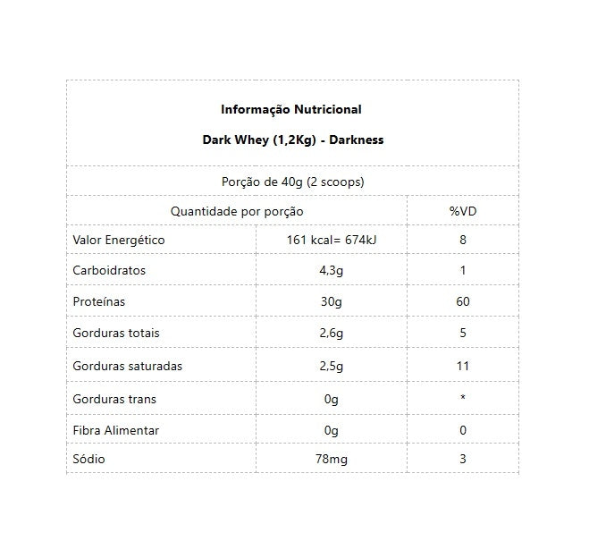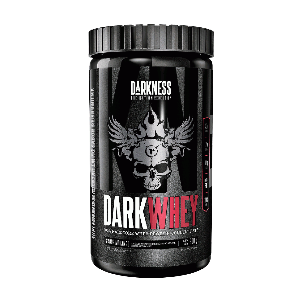 Dark Whey (900g) - Darkness A alta tecnologia de produção Darkness apresenta mais um aliado para os atletas e praticantes de musculação intensa. Dark Whey é um suplemento proteico de alta qualidade, que promove elevada oferta de aminoácidos essenciais de forma prática e saborosa. Por ser um produto estritamente proteico, sem adição de outros nutrientes, pode ser utilizado para modular a ingestão diária de proteínas dos atletas de acordo com suas necessidades, ou seja, consumido puro ou combinado com outros ingredientes. Níveis de intensidade e esforço inatingíveis para a maioria são rotina para os autênticos bodybuilders. Com disciplina ferrenha eles mantêm sob controle cada aspecto do seu desenvolvimento: dieta, treino e foco mental. A linha Darkness traz uma gama de produtos formulados com os ativos primordiais e as altas concentrações exigidas por esses atletas, que buscam hipertrofia e definição em níveis máximos. BENEFÍCIOS: * Até 30g de proteínas;* 3,0g de Leucina;* 100% WPC;* 6,2 g de BCAA;* Ganho de força e massa muscular;* Maior desempenho;* Melhor recuperação Muscular;* Aporte proteico para dietas de emagrecimento.