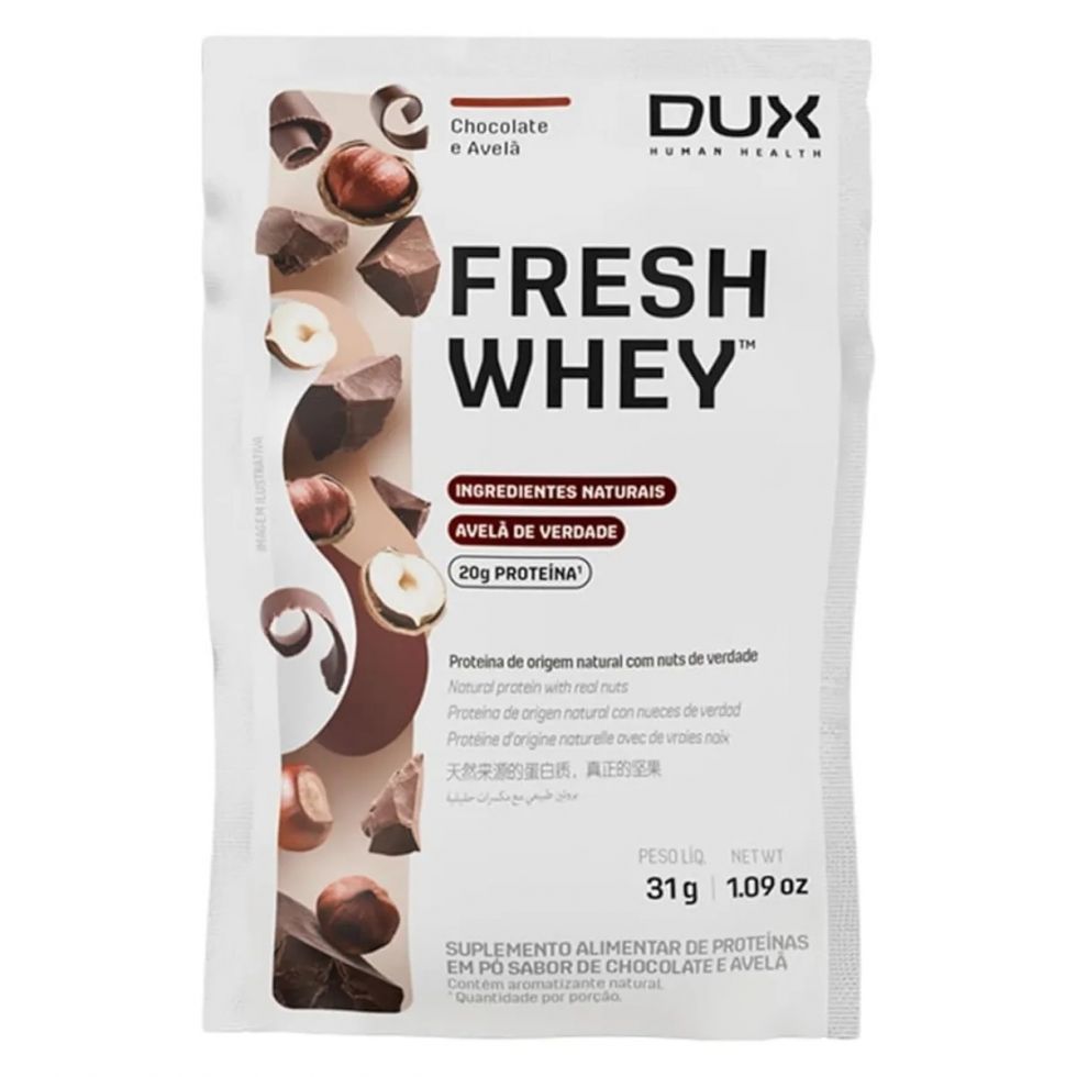 Fresh Whey Sachê (29g)        Fresh Whey DUX Nutrition é uma nova categoria de proteínas, totalmente naturais, feitas com frutas e nuts de verdade, que proporcionam sabores reais, com uma fórmula rigorosamente limpa e pura. Sua fórmula especial com 3 tipos de proteínas do soro do leite: concentrada, isolada e hidrolisada. Essa combinação traz o melhor de cada uma delas: sabor, pureza e qualidade. São 20g de proteína por dose, com alta qualidade e sabor delicioso.    Fórmula rigorosamente limpa e pura, feita exclusivamente com matérias-primas naturais, sem ingredientes inferiores ou artificiais. Seguimos um padrão de excelência na escolha de cada proteína, cada fruta, cada ingrediente. As proteínas são os suplementos mais famosos e mais populares. É fácil entender por quê. A proteína é o alicerce nutricional do corpo, sendo encontrada nos músculos, ossos, pele, cabelos, e basicamente em todas as outras partes ou tecidos do corpo.      Ela é feita de mais de 20 moléculas construtoras chamados aminoácidos, que participam de muitas reações químicas. Pelo menos 10.000 proteínas diferentes nos fazem como somos, e nos mantém assim.     Experimente o que há de melhor com o Fresh Whey DUX Nutrition! Benefícios:* Sem adição de açúcares;* Sem conservantes;* 20g de proteína por dose;* 4,5g de BCAA’s;* Recuperação muscular;* Ganho de massa muscular;* Perda de massa muscular;* Auxilia na saciedade:* Sem espessantes;* Sem estabilizantes;* Sem ingredientes inferiores.
