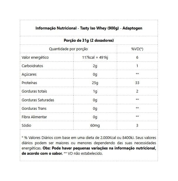 Tasty Iso Whey (900g) Tasty Iso, proteína isolada e hidrolisada que, garante rápida absorção pelo organismo, recuperação pós-treino, ricos nutrientes para otimizar os resultados e com delicioso sabor. É processado a frio, mantendo os benefícios de seus ingredientes, entre eles, dos aminoácidos com fatores imunes anti-inflamatórios e peptídeos que estimulam o metabolismo, juntamente com os antioxidantes e minerais alcalinos. Não possui lactose, glúten, tem baixo índice de carboidrato e gorduras. Tasty Iso é fabricado com a prática de processamento mais avançada, o que garante sua qualidade. Dessa forma, Tasty Iso se torna fonte rica em proteínas de maior valor biológico (VB), o que significa que mais proteínas são absorvidas pelo seu corpo e rapidamente. Cada dose oferece 5,5 g de BCAA’s, incluindo 2,6 g de Leucina e todas as micro frações intactas encontradas em um isolado de proteína de soro de leite de qualidade. --* O melhor Whey Protein 100% isolado do mercado: Tasty Iso, alta qualidade e muito saborosa. Solução ideal para seus desafios diários! Benefícios: - Melhora o desempenho muscular;- Ajuda a prevenir e tratar a diabete;- Auxilia o ganho de massa magra;- Zero açúcares e zero lactose;- 25g de proteínas por porção;- Mais de 5,5 g de BCAAs por dose;- Rápida absorção.