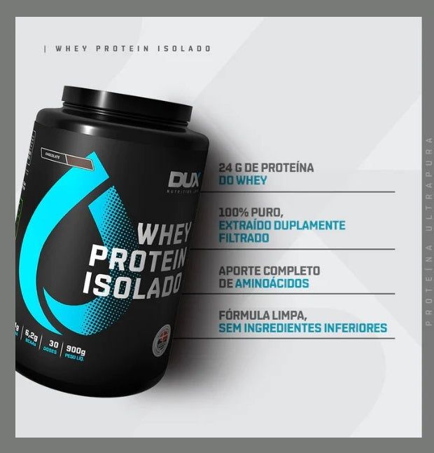 Whey Protein Isolado Pote (900g) - Dux Nutrition O Whey Protein Isolado Dux Nutrition possui baixo teor de gorduras e carboidratos, sendo ideal para construção e recuperação muscular sem perda de definição, como um snack fit prático ou sem culpa em suas receitas. Uma proteína 100% pura, duplamente filtrada, sem adição de outro tipo de Whey ou de proteínas inferiores. Se há um nutriente indispensável, é a proteína. Ela é feita de aminoácidos, que são os blocos de construção do nosso corpo. A proteína do soro do leite, em inglês “Whey Protein”, é uma das fontes de aminoácidos de melhor absorção, maior até que o frango ou peixe. Isso torna o Whey uma forma conveniente de ingerir proteína, melhorando a saúde, o bem-estar e os resultados dos treinos. BENEFÍCIOS * Matéria-prima premium importada, obtida através do processo de extração de microfiltragem, sem renunciar do sabor real das nossas proteínas;* Aporte completo de aminoácidos: 6,2g de BCAAs; 4,7g de glutamina e 2,9g de leucina, por dose;* 24g de proteína;* Disponível em versões sem adoçantes artificiais, 100% naturais;* O nome diz tudo: Whey Protein Isolado 100% puro, com transparência total, do nome do produto à lista de ingredientes;* Não contém goma xantana, complexos vitamínicos à base de maltodextrina, espessantes, estabilizantes, conservantes ou qualquer outro ingrediente inferior;* Proteína moderna, desenvolvida por especialistas para atletas de esportes de performance (bodybuilding, crossfit e artes marciais), pessoas que buscam uma proteína com baixa caloria (para snacks fit e receitas sem culpa) e pessoas que buscam uma proteína ultrapura de altíssima qualidade;* Contém corantes 100% naturais, sem ingredientes artificiais. Embalagem disponível: pote contendo suplemento na forma de pó. Sabores: Baunilha, Chocolate, Coco e Morango. Peso Líquido: 900g