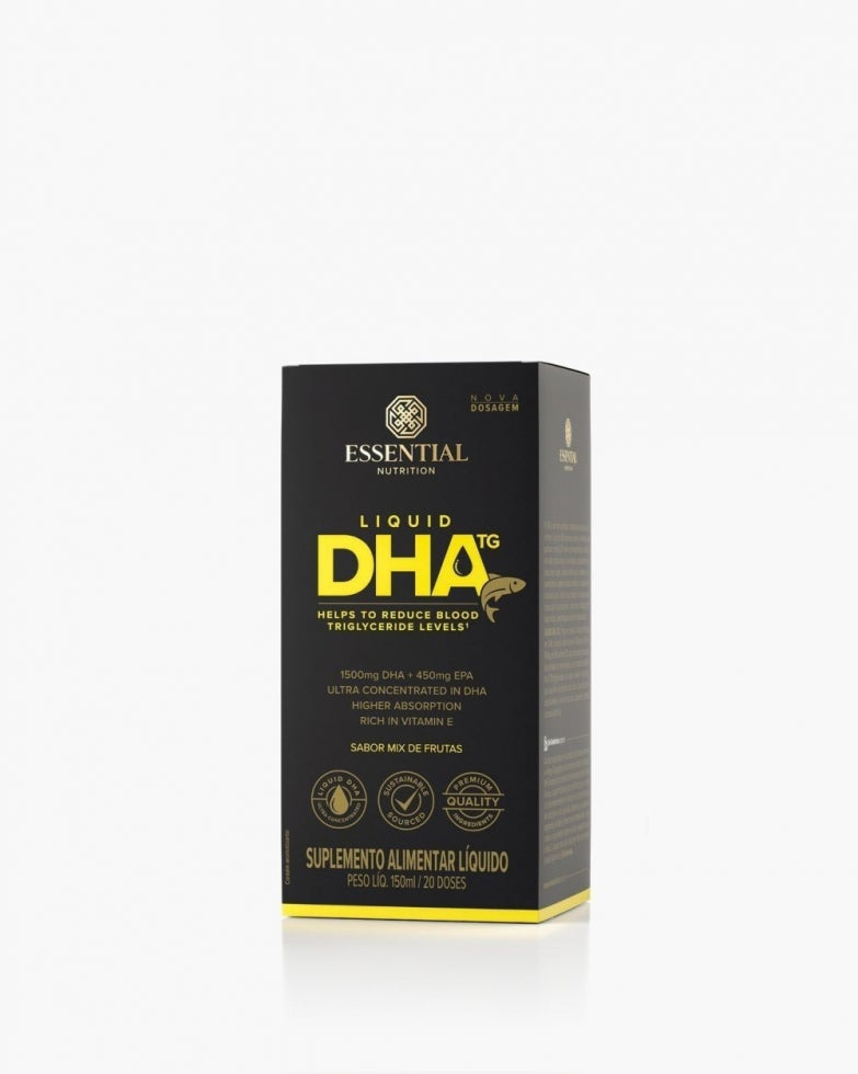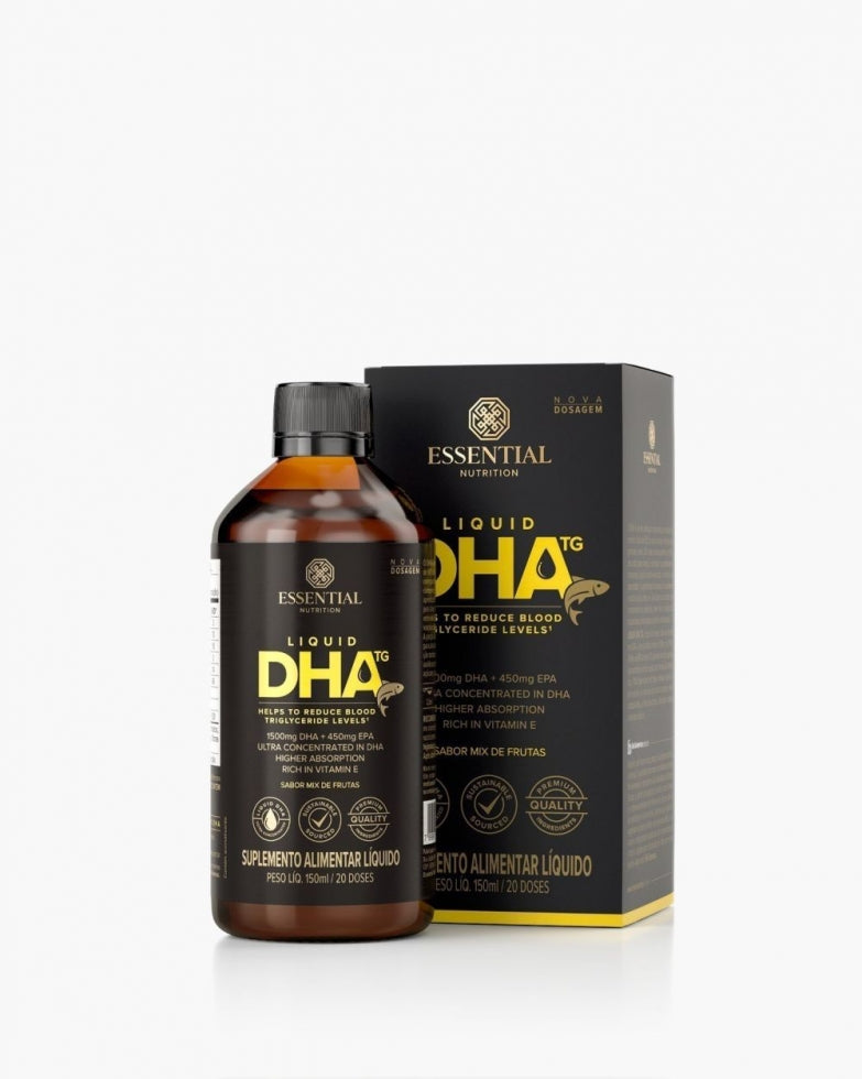 DHA TG Líquido (150ml) - Essential Nutrition O Dha Tg possui uma importância notável, visto que 60% do nosso cérebro é formado por gorduras, e até 20% delas corresponde ao DHA. Normalmente, os níveis de DHA diminuem com o avançar da idade, em particular na região do hipocampo (memória e navegação espacial). DHA TG Essential é fonte de ômega-3 ultraconcentrado em DHA. Cada cápsula possui 500mg de DHA + 100mg de EPA e sua forma em TG (triglicerídeos) favorece a absorção. Na natureza, o ômega-3 proveniente do óleo de peixe apresenta-se na forma de triglicerídeos (TG). Portanto, quando trazemos o óleo de peixe padronizado nesta mesma forma, fica mais fácil para o nosso organismo reconhecer e absorver, proporcionando também mais conforto gástrico. 30% MAIS ABSORÇÃO. O ácido graxo DHA é uma das principais gorduras estruturais do cérebro, é um componente fundamental na formação de toda a estrutura cognitiva. DHA TG Essential tem sua origem nos peixes presentes nas águas profundas, correntes geladas e não poluídas e extraídos na Costa da Noruega. Através do processo de destilação molecular, obtém-se um óleo de peixe puro, ultraconcentrado e padronizado em DHA. DHA TG apresenta padrões de pureza extremamente rígidos em relação aos metais pesados e demais contaminantes como PCBs, mercúrio e dioxinas. Benefícios:* Proteção da retina dos olhos e consequentemente prevenção e auxilio à tratamentos em distúrbios oculares;* Pode prevenir doenças como Alzheimer;* Benefícios na formação cerebral em crianças;* Alta concentração DHA por dose;* Na forma de triglicerídeos;* Rápida absorção;* Proteção do funcionamento do cérebro e memória (concentração, raciocínio, depressão, memória);* Obtido por processo diferenciado e patenteado de destilação molecular que proporciona a pureza do óleo de peixe sem a presença de metais pesados e contaminantes como PCBs, mercúrio e dioxinas;* Rico em Vitamina E.