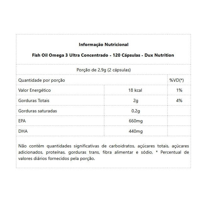 FISH OIL ÔMEGA 3 CONCENTRADO - 120 Cápsulas - Dux Nutrition  O que é      Ômega-3 Fish Oil™ é uma fórmula avançada de ômega-3, ultrapuro e altamente potente. Feito com óleo de sardinha e salmão, é o óleo perfeito para sua máquina mais importante: seu corpo. São 660mg de EPA e 440mg de DHA (duas importantes formas de ômega-3) por dose. Sua matéria-prima é importada sob princípios de sustentabilidade ambiental, livre de metais pesados, PCB’s, e impurezas não desejadas.   Ideal Para      Ômega 3 Fish Oil™ é para todos que buscam escolhas mais saudáveis, fornecendo quantidades ideais deste nutriente essencial.   Por trás do rótulo      O ômega-3 é composto por EPA e DHA, os dois principais ácidos graxos envolvidos na fisiologia humana, sendo encontrado em alguns peixes, na linhaça, e em frutos secos como nozes. Como o corpo não é capaz de produzi-lo, obtê-lo diariamente da dieta pode ser um desafio, tornando o suplemento uma opção conveniente e segura de garantir sua ingestão. MEG-3® é um selo de qualidade internacional que garante que o produto cumpre os mais altos padrões de excelência de ômega 3, e de extração sustentável do óleo de peixe.   BENEFÍCIOS: * Selo MEG 3; * Colabora com o aumento do HDL, colesterol bom no sangue; * Contribui com a manutenção dos níveis de triglicerídeos; * Diminui a produção de VLDL, que é uma proteína produzida pelo fígado que aumenta os níveis de triglicerídeos no sangue; * Alivia problemas na pele, como eczemas e psoríase; * Atenua inflamações, como a artrite; * Melhora a densidade mineral óssea.