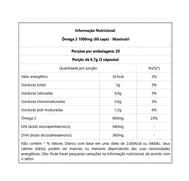 Ômega 3 1000mg (60 caps) O Ômega 3 1000mg (Óleo de Peixe) 120 Cápsulas Maxinutri é suplemento em cápsulas em alta concentração obtido de peixes de águas frias e profundas, sendo assim livres de metais pesados e máxima pureza. O Ômega 3 1000mg é um ácido graxo poli-insaturado essencial, sendo assim nosso corpo não produz e para sua obtenção será através de alimentação ou suplementação. Cada porção possui 540mg de EPA (Ácidos Eicosapentaenoico) e 360mg de DHA (Ácidos Docosahexaenoico), o primeiro atua para melhor saúde do sistema cardiovascular por controle dos níveis de colesterol além de sua ação anti-inflamatória. Já o DHA, favorece a saúde cerebral e tem ação antioxidante, protegendo assim nossas células contra os efeitos nocivos dos radicais livres com nosso corpo. Benefícios: - Alto Teor de EPA (540mg e DHA (360mg);- Saúde do Coração;- Poder Antioxidante;- Aumenta a quantidade de oxigênio e de nutrientes que chegam nos neurônios;- Melhora o desempenho intelectual e a saúde das células do cérebro;- Com propriedades anti-inflamatórias.