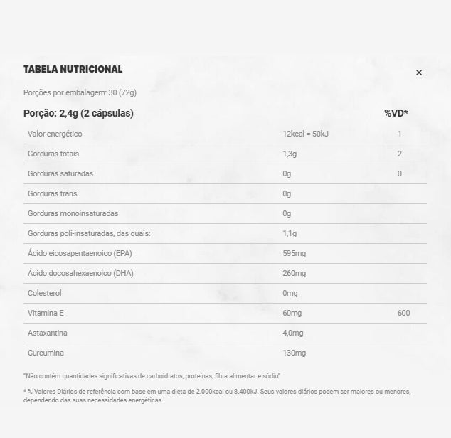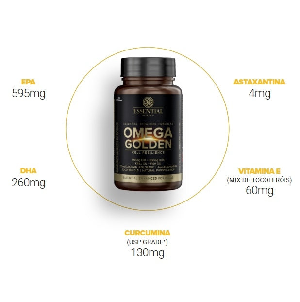 Ômega Golden (60 caps)       Os benefícios do ômega-3 já são bastante conhecidos e comprovados por inúmeros estudos científicos. Porém, quando associamos diferentes fontes desse nutriente e adicionamos outros ingredientes, surgem fórmulas avançadas e com novas possibilidades.     Ômega Golden apresenta uma combinação exclusiva de ingredientes que passam a atuar em sinergia quando estão juntos, aprimorando as propriedades de cada um dos seus componentes. Para termos uma fonte ainda mais rica e eficiente de ômega-3, agregamos o óleo de krill em fosfolipídeos ao óleo de peixe em triglicerídeos e concentrado em EPA, o que favorece uma perfeita harmonia com a formulação.     Então, adicionamos os poderes milenares da curcumina (USP Grade¹) e a potência da astaxantina e da vitamina E, antioxidante que auxilia na proteção dos danos causados pelos radicais livres. Confira abaixo seus principais compostos: ** KRILL OIL + FISH OIL - A melhor combinação para o seu organismo - Os avanços nas pesquisas científicas estão revelando que, dependendo do tipo de célula, fontes distintas de ômega-3 podem ter níveis de absorção diferentes.  O ômega-3 do óleo de krill entra de forma mais rápida e eficiente nos glóbulos vermelhos do sangue. O ômega-3 do óleo de peixe tem melhor absorção em outras células do nosso plasma e também nas plaquetas. Por esses motivos, a união dos óleos de krill e de peixe é o que há de melhor na suplementação de ômega-3 atualmente. ** CURCUMINA - Todo o poder de um ingrediente milenar - Poderosa substância bioativa presente na cúrcuma, tem excelentes propriedades nutricionais. Nessa formulação, ela atende aos mais rigorosos requisitos de pureza e qualidade estabelecidos pela United States Pharmacopeia - USP (Farmacopeia Americana). Por ser um composto lipossolúvel, que precisa de gordura para ser absorvido, o seu aproveitamento no organismo é otimizado tanto pelo óleo de krill quanto pelo óleo de peixe. ** ASTAXANTINA - O antioxidante natural mais potente do mundo - Conhecido como o “rei dos carotenóides”, possui diversos atributos nutricionais. Sua principal fonte é a alga verde Haematococcus pluvialis, mas pode ser encontrada também em frutos do mar. ** MIX DE TOCOFERÓIS - A mais pura vitamina E - Uma associação de diferentes tipos de tocoferóis que resulta na forma mais completa da vitamina E encontrada na natureza. Além disso, intensifica o seu potencial antioxidante.  BENEFÍCIOS: - Matéria prima Superba™ Boost, certificado como 100% puro óleo de krill;- 595mg de EPA + 260mg de DHA;- 130mg de Curcumina;- 14mg Astaxantina;- Tem propriedades anti-inflamatórias potentes que ajuda a reduzir a inflamação crônica;- Propriedades antioxidantes que ajuda a proteger as células dos danos causados pelos radicais livres;- Melhora a função cerebral como a memória, a linguagem, raciocínio e a capacidade cognitiva em geral;- A Astaxantina pode ajudar a melhorar a saúde da pele, reduzindo os danos causados pelo sol e melhorando a hidratação;- Fortalecimento do sistema imunológico.