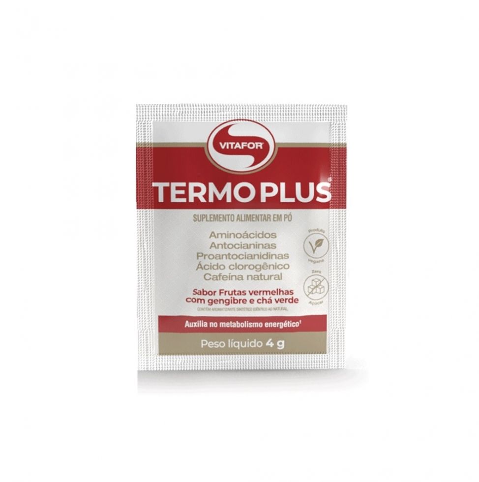 Termo Plus Sachê (4g) TERMO PLUS® é um suplemento alimentar à base de aminoácidos, vitaminas e minerais da Vitafor. A combinação de Laranja Moro, Café Verde, Ácido clorogênico e o Cromo agem em sinergia na fórmula, tornando ainda mais efetiva na melhora do desempenho, no metabolismo de proteínas, carboidratos e gorduras. Além de conter elementos termogênicos em sua formulação, TERMO PLUS® é enriquecido com vitaminas e minerais. Esses nutrientes ajudam a combater os radicais livres, que são precursores de diversas condições de saúde, e contribuem para o metabolismo de proteínas, carboidratos e gorduras. Benefícios: - A vitamina C e a niacina (vitamina B3) auxiliam no metabolismo energético;- A vitamina C, o selênio e o zinco auxiliam no funcionamento do sistema imune;- A niacina contribui para a manutenção da pele e o zinco contribui para a manutenção do cabelo, da pele e das unhas;- A niacina, o cromo e o zinco auxiliam no metabolismo de proteínas, carboidratos e gorduras e a vitamina C auxilia no metabolismo de proteínas e gorduras;- A vitamina C e os minerais selênio e zinco são antioxidantes que auxiliam na proteção dos danos causados pelos radicais livres;- O zinco auxilia na visão, na síntese de proteínas e na manutenção de ossos. Diferenciais: - Cafeína naturalmente presente nos ingredientes, em quantidade aproximadamente 106 mg por porção;- Com ácido clorogênico, laranja moro e Cromo;- Fonte de aminoácidos, vitaminas e minerais;- Fácil solubilidade;- Selo de Qualidade VLabor