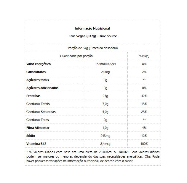 True Vegan – True Source O TrueVegan oferece pureza, alegria e alinha o bem estar ao máximo do seu rendimento físico. São 23g de proteína orgânica e limpa que fornece um complexo perfil de todos os aminoácidos essenciais – incluindo 5,5 g de BCAAs e 5g de glutamina – e auxiliam na redução do tempo de recuperação após o exercício e no ganho de massa muscular. O sabor importa sim! A combinação das proteínas de ervilha e do arroz com adição de farinha de amêndoa de castanha de caju e chia em pó, proporcionam uma cremosidade única. Além de vitamina B12 para acelerar a absorção e a digestão, sem causar nenhum incômodo, mantendo um sabor único e irresistível. Estamos em harmonia não só com a sua saúde, mas com o que acreditamos. Tudo o que somos, fazemos e consumimos vai além de um estilo de vida. Benefícios:* Proteína isolada e limpa: feita de arroz e ervilhas;* Ótima concentração de proteína por dose: 23g;* 5g de glutamina e 5,5g de BCAA;* Enriquecido com Vitamina B12;* Textura cremosa e incrível.