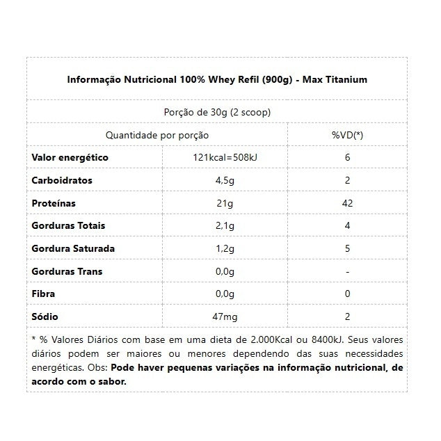 100% Whey Refil (900g) – Max Titanium 100% Whey Protein Max Titanium é um suplemento à base de proteína específica do soro do leite (Whey Protein Concentrate), matéria-prima elaborada com alta tecnologia, de elevado valor biológico, rápida digestibilidade e alta concentração de aminoácidos essenciais, que são fatores de relevância para auxiliar a síntese proteica muscular. O consumo de suplementos proteicos, associado a uma alimentação saudável e prática de atividade física auxilia na formação de músculos e ossos. Benefícios: * Alta quantidade de BCAA’s; * Alto valor biológico; * Coadjuvante na formação de massa muscular; Recuperação muscular pós-treino.