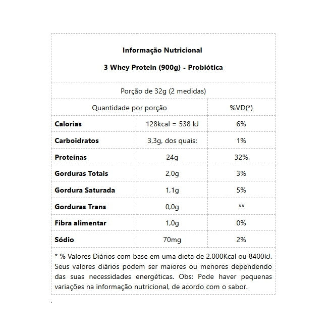 3 WHEY PROTEIN (900g) - PROBIÓTICA 3 Whey Protein da Probiótica é um suplemento proteico composto basicamente por Whey Protein nas suas diversas formas: Proteína concentrada do soro de leite (Whey Protein Concentrate - WPC), Proteína isolada do soro do leite por microfiltração (Microfiltered Whey Protein Isolate - WPI) e Proteína hidrolisada do soro de leite (Whey Protein Hydrolyzed - WPH), proteínas elaboradas com alta tecnologia, de excelente digestibilidade e elevada concentração de aminoácidos. 3 WHEY PROTEIN® é o suplemento ideal para ser tomado antes, durante ou após os exercícios. BENEFÍCIOS: * Alto valor biológico; *Coadjuvante na formação de massa muscular; * Recuperação muscular pós-treino.