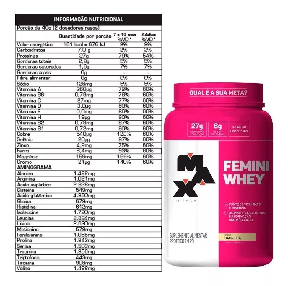 FEMINI WHEY (900G) - MAX TITANIUM As proteínas do soro do leite, também conhecidas como whey protein, são extraídas durante o processo de fabricação do queijo. Possuem alto valor nutricional, com alto teor de aminoácidos essenciais, de cálcio e de peptídeos bioativos do soro. Essa importante matéria-prima é o principal componente do FEMINI WHEY. Além disso, o produto também contém a proteína isolada da soja, importante por ter em sua composição boas quantidades de BCAA, ácido glutâmico e arginina, compostos significativos para o crescimento e recuperação muscular. FEMINI WHEY conta ainda com colágeno hidrolisado e um complexo vitamínico, sendo direcionado ao público feminino. BENEFÍCIOS: * ALTA QUANTIDADE DE BCAA; * ALTO VALOR BIOLÓGICO;* COADJUVANTE NA FORMAÇÃO DE MASSA MUSCULAR; * RECUPERAÇÃO MUSCULAR PÓS-TREINO.