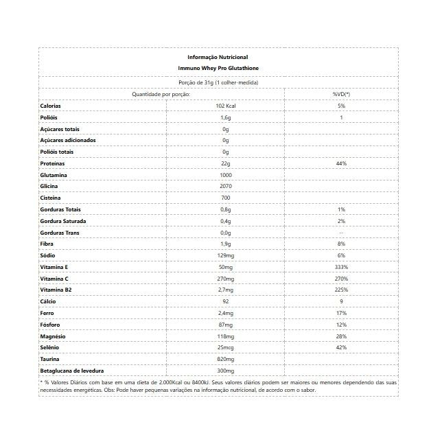 Immuno Whey Pro Glutathione Lata - Essential Nutrition Ao Whey Protein Isolado e Hidrolisado, adicionamos os aminoácidos - cisteína, glicina e glutamina - precursores da glutationa, além das vitaminas e minerais, cofatores nesse processo de síntese.Para deixar a fórmula ainda mais completa, incluímos a taurina, a vitamina C e o mix de tocoferóis, potencializando o poder antioxidante do produto, além da betaglucana de levedura (beta - 1,3/1,6 glucan), conhecida por suas grandes propriedades. Potencializamos os efeitos do whey protein. O whey protein por si só já é considerado o suplemento com a maior capacidade de estímulo da produção de glutationa no corpo. Quando adicionamos os nutrientes necessários para este processo de síntese, conseguimos potencializar ainda mais esta produção, e assim aumentar significativamente os níveis de glutationa no organismo. Contém:* Whey Protein Hidrolisado e Isolado (Thermax® 690 e Provon® 292)* Aminoácidos precursores da produção natural de glutationa (cisteína, glicina e glutamina)* Vitaminas e minerais, cofatores na produção natural de glutationa* Taurina* Purified beta - 1,3/1,6 glucan* Puro cacau* Estévia Não Contém:* Proteínas concentradas* Caseína* Açúcar* Glúten* Lactose* Conservantes* Adoçantes artificiais* Aromas artificiais* Corantes artificiais