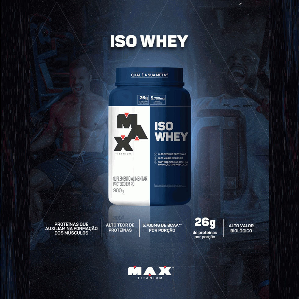 ISO WHEY (900g) - MAX TITANIUM O ISO WHEY da Max Titanium contém 100% de WHEY PROTEIN ISOLADO, isso significa que o produto possui elevada concentração proteica. Desenvolvido com matéria-prima de tecnologia específica, que proporciona excelente digestibilidade e máxima absorção, o ISO WHEY tem baixíssima quantidade de carboidratos por porção.Desenvolvido com matéria-prima de tecnologia específica, que proporciona excelente digestibilidade e máxima absorção. BENEFÍCIOS: * Alta concentração proteica com baixíssimo teor de carboidratos* 26g de proteína por porção* Zero glúten e Zero açúcar adicionado* Proteínas de alto valor biológico* Fonte de aminoácidos essenciais* As proteínas auxiliam na formação dos músculos e ossos* Alto teor de proteínas