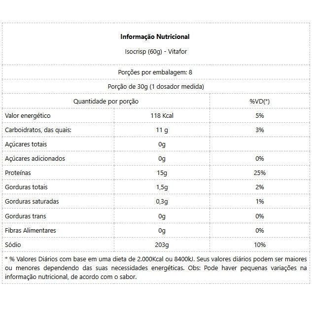 Isocrisp Plant Refil (240g) ISOCRISP® Vitafor é uma forma inovadora de consumir proteína. Através de alta tecnologia, desenvolvemos delicioso “Crisp” proteico à base de Whey Protein Isolate (proteína isolada do soro de leite) e Whey Protein Concentrate (proteína concentrada do soro do soro de leite), que pode ser consumido juntamente com cereais matinais, saladas de frutas, pudins, sorvetes, gelatinas, caldos e sopas.? Consumir proteínas não precisa ser algo chato. A fórmula inovadora de ISOCRISP® possibilita que você complemente a necessidade diária de proteína de forma criativa. Com doces ou salgados, no café da manhã, lanches, almoço e ou jantar, use ISOCRISP®. Benefícios: ** Combinação de carboidrato e proteína, que atuam como excelente pré/pós-treino;** Pode ser adicionado junto as refeições promovendo maior aporte proteico (disponibilidade de proteína);**Reforço na suplementação proteica**Estimula a mastigação; saciedade em preparações;** Contém L-Glutamina e BCAA. Diferenciais: ** Sabor Neutro;** Versatilidade em preparações doces e salgadas;** Whey Protein Isolate em formato de chips crocantes;** Selo de Qualidade VLabor;