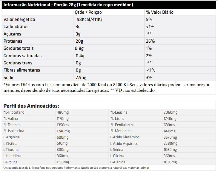 PURO PERFORMANCE WHEY (909g) - PERFORMANCE NUTRITION      PURO PERFORMANCE WHEY é uma proteína extraída do soro do leite 100% pura, que possui os componentes biologicamente ativos característicos desta proteína: Alfa-Lactalbumina, Imunoglobulina (Ig) e Lactoperoxidase, trata-se de uma formula com Whey Protein Concentrado de alto valor biológico, com um espectrum completo de aminoácidos, cuja porção de 28g fornece 9,5g de Aminoácidos Essenciais, sendo 4,5g de BCAA’s dos quais 2g é leucina, é instantâneo e adoçado com STEVIA, um adoçante Natural.  BENEFICIOS:* Whey Protein Concentrada microfiltrada;* Ideal para ganho de massa muscular;* Promove melhor recuperação da musculatura;* 20g de whey por dose;* 9,5g de aminoácidos essenciais;* Adoçado com Stévia;* Não contém corantes;* Não contém Glúten.