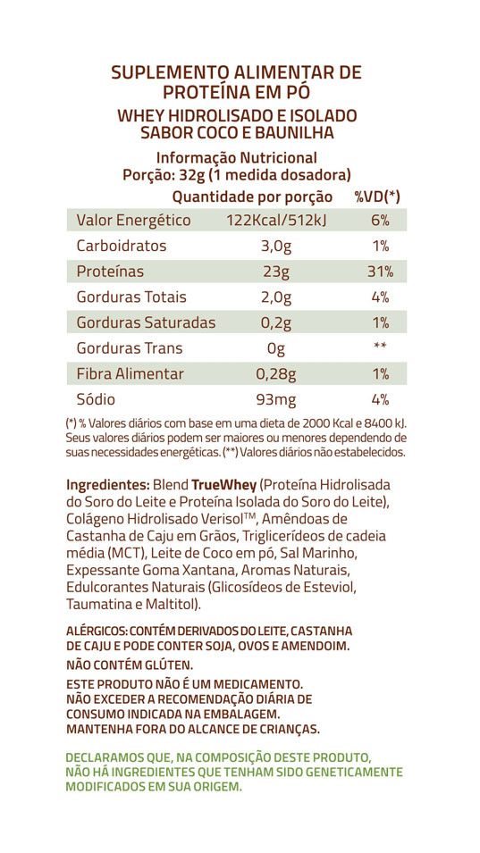 TRUE WHEY HIDROLISADO E ISOLADO (837g) - TRUE SOURCE WHEY LEVE, LIMPO, NATURAL E INCRIVELMENTE DELICIOSO! Nosso True Whey tem um blend especial das mais puras filtrações, a hidrolisada e isolada. Lhe oferecemos 23 gramas de proteína e 5,3 gramas de BCAAs na dose, além de 2,5 gramas de Verisol®. Nosso whey é para quem buscar o melhor! O melhor resultado e com melhor produto. O True Whey pode ser utilizado para quem busca o emagrecimento verdadeiro, já que é rico em proteínas e gorduras do bem, que lhe deixará durante mais tempo com aquela sensação de conforto e saciedade. Para os que buscam volume muscular ele é ideal, pois contem proteínas rapidamente utilizadas pelo seu corpo, aumentando ainda mais a síntese proteica e aporte nutricional adequado. Nosso whey ama a natureza, pois ele é extraído de leite de vacas que são criadas soltas e são livres de rações com aditivos químicos, antibióticos ou hormônios. Em nosso whey tem 5,3 gramas de BCAAs, que são os aminoácidos de cadeia ramificada, muito importantes para a manutenção da massa magra, evitando o catabolismo e a fadiga muscular, porque sabemos que ninguém merece ficar com aquela sensação de cansaço excessivo após um treino mais intenso. Além dos BCAAs, a Glutamina também faz parte da composição. 5 gramas desse aminoácido tão importante para a imunidade, pois nutri as células intestinais e fundamental para a recuperação muscular. Para nós, a beleza vem de dentro e pensando nisso que adicionamos na formulação o peptídeo do colágeno hidrolisado Verisol®. Um peptídeo que passa integro pela sua mucosa intestinal e vai direto para os fibroblastos e elastinas, estimulando ainda mais a produção de colágeno nessas células, diminuindo comprovadamente, as linhas de expressão, melhorando aspecto da pele. E sabe o que é ainda melhor? Que se você fizer o uso continuo, irá diminuir também a celulite, estrias e a flacidez. Puro como a natureza deve ser, o True Whey é adoçado com estévia, taumatina e maltitol, adoçantes naturais, além de ser livre de qualquer corante ou aditivo artificial. BENEFÍCIOS: * Proteína isolada e hidrolisada;* Ótima dose de concentração de proteína por dose: 23g;* 5,3g de BCAA;* Gourmet, adoçado com stévia e taumatina;* Não contém Glúten e Lactose;* Sabor e cremosidade incomparáveis;* Possui Peptídeos bioativos de colágeno Verisol.