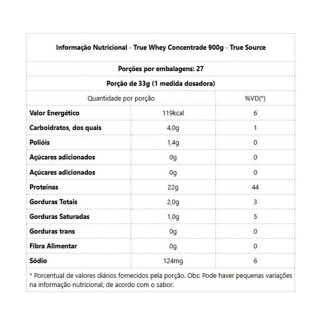 True Whey Concentrate (900g) WHEY NATURAL, SABOROSO E ZERO LACTOSE! A mais pura e nutritiva das proteínas, agora na versão concentrada e livre de lactose, assim podemos definir a TRUE CONCENTRATE. Uma proteína limpa, leve, com colágeno Verisol e os mais puros ingredientes, pois a True é assim, pura, natural e limpa. A TRUE CONCENTRATE, onde o leite é extraído de vacas criadas soltas, livre de rações transgênica e com qualquer tipo de hormônios e antibióticos. Além disso você estará consumindo uma proteína que preserva compostos bioativos como a lactoferrina e imunoglobulinas essenciais para saúde e imunidade. Disponível em vários sabores, nossa proteína tem um sabor inigualável com uma cremosidade única, deixando você sempre com um sabor de quero mais. Adoçamos as nossas proteínas com adoçantes naturais e não usamos aromatizantes ou corantes artificiais. Natural para que você possa aproveitar o que existe de melhor na natureza. Assim é a nossa TRUE CONCENTRATE, nutritiva, limpa, natural e deliciosa. True Concentrate sabor Coconut Icecream, o mais queridinho de todos! O coco é uma iguaria muito apreciada pelos brasileiros. Seja de forma natural ou em receitas, é inegável que o sabor atraente combina com diversas ocasiões. Benefícios: - 22g de proteínas;- Fonte de BCAA’s;- Zero lactose;- Adoçantes Naturais;- Possui Colágeno;- Volume muscular;- Manutenção da massa magra;- Produzido em ecossistema que promove o bem estar animal;- Fortalece a imunidade;