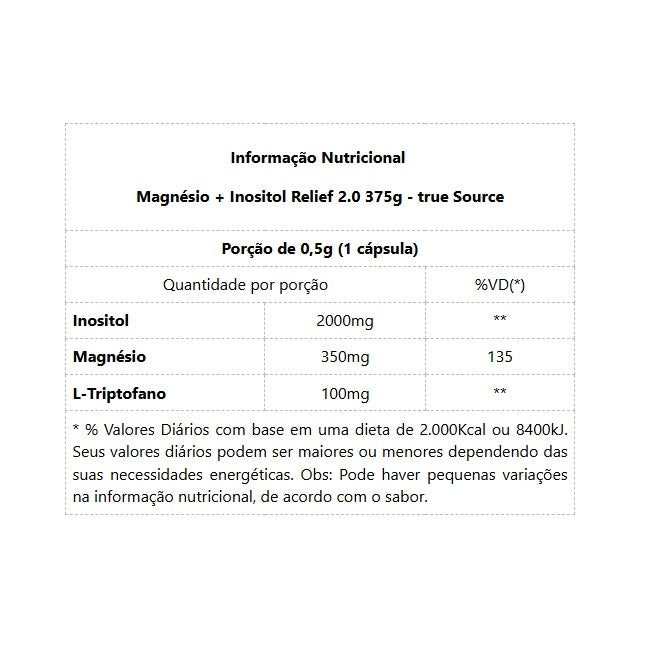 Magnésio + Inositol Relief 2.0 (375g) O que era bom ficou ainda melhor! Agora nosso querido Magnésio Inositol Relief vem na versão maracujá com passion flower e L-Triptofano para quem procura relaxamento e melhora do sono! Nosso produto conta com 100mg de L-Triptofano e passion flower, que proporciona uma maior liberação de serotonina, neurotransmissor responsável pela sensação de bem-estar, satisfação e felicidade. Quando você tem uma adequada liberação de serotonina, naturalmente você produz mais melatonina, melhorando ainda mais seu sono e fazendo ele ser reparador. Estudos também mostram que quando você tem níveis adequados de serotonina, você tende a ter menos vontade de doces, principalmente final do dia, que é quando há uma queda desse neurotransmissor. Então o Magnésio Inositol 2.0 lhe ajudará a diminuir episódios de compulsões alimentares. Agora, você terá um produto ainda mais completo! BENEFÍCIOS: - 2g de inositol por dose;- Fórmula clean sem corantes, aromas e adoçantes artificiais;- Zero glúten, açúcar e lactose;- Promove o relaxamento;- Melhora a qualidade do sono;- Saúde cardiovascular.