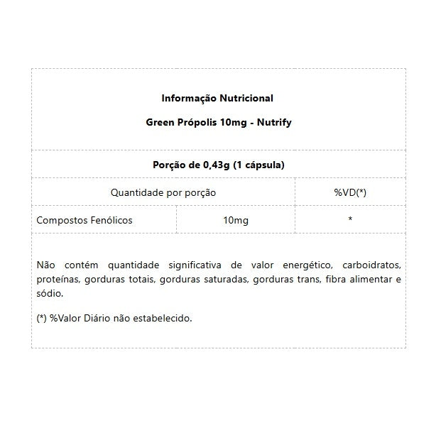 Green Propolis (60 caps) - Nutrify      Green Própolis Nutrify é o resultado de um intenso trabalho de pesquisa, cujo objetivo principal era uma suplementação de própolis com a maior concentração e o mais alto grau de pureza. Com extrato padronizado, cada cápsula fornece 10 mg de compostos fenólicos, 3,96 mg de flavonoides e 4,5 mg de Artepillin-C.       Uma extração precisa e padronizada, capaz de garantir a maior concentração de compostos fenólicos e flavonóides, dos quais obtemos os benefícios amplamente comprovados da suplementação com própolis.        Cada cápsula softgel de Propolis Nutrify fornece 99 mg de própolis verde em extrato seco a 70% de concentração, 10mg de compostos fenólicos, 3,96 mg de Flavonoides e 4,5 mg de Artepillin-C, naturalmente provenientes da própolis de alecrim do campo.      A própolis, produzida por abelhas a partir de resinas vegetais, possui atividade antiviral e potencialmente pode interferir na invasão pelo SARS-CoV-2.1.    Os compostos fitoquímicos que se mostram promissores para a inibição do coronavírus em humanos incluem quercetina, miricetina e ácido caféico, todos componentes da própolis,1,3 além de ter propriedades antimicrobianas, antiinflamatórias, imunomoduladoras e antioxidantes.        Benefícios:* Ação Antioxidante; * Cicatrizante e Anti-inflamatória;* Imunomoduladora;* Antiviral.