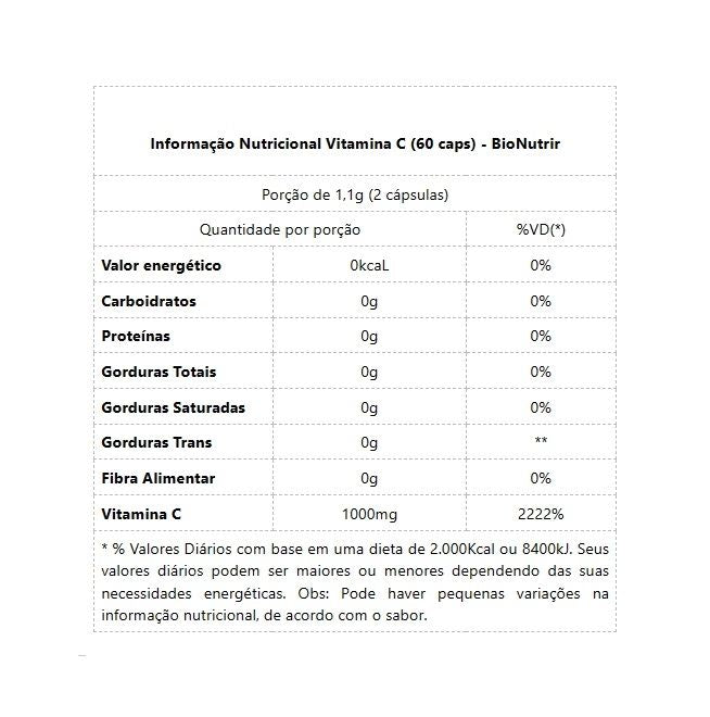 Vitamina C (60 caps) - BioNutrir A Vitamina C é um potente agente antioxidante e ativador das reações fisiológicas de proteção, desenvolvendo assim ações de proteção contra os processos gripais e resfriados. A deficiência de Ácido Ascórbico ( Vitamina C), denominada de escorbuto se manifesta através dos seguintes sintomas: cansaço, sangramentos mucosos e cutâneos, gengivites, perda de dentes, anemia, diminuição da resistência às infecções, retardo do tempo de cicatrização das feridas, etc.Benefícios:* Auxilia No funcionamento do sistema imune;* Auxilia No metabolismo energético e de proteínas e gorduras;* Auxilia Na formação do colágeno;* Auxilia Na absorção de ferro dos alimentos;* Auxilia Na proteção dos danos causados pelos radicais livres;