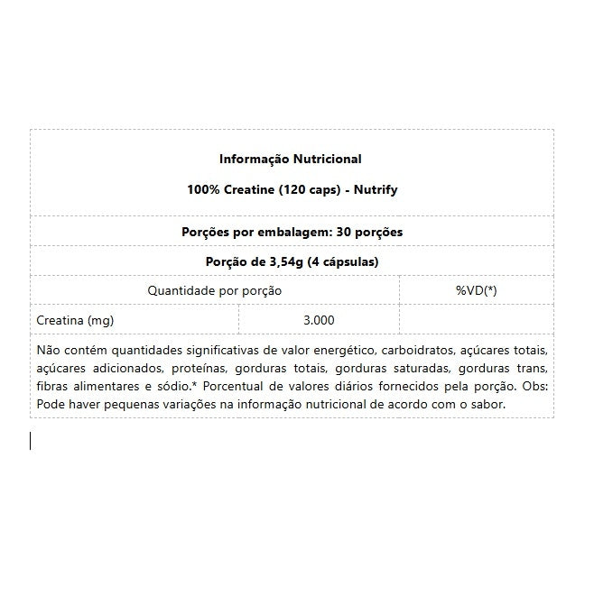 100% Creatine (120 caps) Prática e Indispensável Os benefícios da suplementação de creatina são amplamente comprovados pela ciência. 100% Creatine em cápsulas Nutrify torna o consumo ainda mais prático, fornecendo 3g de creatina por dose. Fabricada com creatina monohidratada, garantindo alto grau de pureza, é livre de corantes, conservantes e aditivos, tornando-se uma suplementação eficaz e segura. Benefícios: - Oferta 3g de creatina na dose diária recomendada; - Aumento da força e do desempenho físico;- Melhora do desempenho cognitivo;- Aumento da massa muscular.