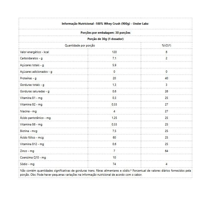 100% Whey Crush (900g)       A nossa Whey Protein 100% Whey Crush é um convite para uma nova experiência sensorial, onde pela primeira vez combinamos um sabor gourmet deliciosamente surpreendente com benefícios inigualáveis. Além disso, conquistamos 3 selos essenciais que demonstram o nosso poder de inovação:  O primeiro selo é o Vitamin Blends      A nossa Whey Protein 100% Whey Crush tem um Blend Único de vitaminas que conta com: Vitamina B1, Vitamina B2, Niacina, Acido Pantotênico, Vitamina B6, Biotina, Acido Folico, Vitamina B12 e Zinco. Esse Blend auxilia na: * Recuperação muscular pós treino;* Aumento da imunidade;* Manutenção do foco e energia;* Saúde cardiovascular;* Redução do cansaço e fadiga.  O segundo selo é o Coenzima Q10      A nossa Whey Protein 100% Whey Crush tem Coenzima Q10 que funciona como: * Antioxidante e energizante;* Anti envelhecimento;* Auxilia no controle do colesterol.  O terceiro selo é o Glúten Free      Livre de glúten a nossa Whey Protein 100% Whey Crush contribui para: * Auxílio na saúde digestiva e redução de sintomas gastrointestinais;* Auxílio na saúde intestinal, reduzindo inflamação e desconforto abdominal;* Auxílio na melhora da saúde em geral.