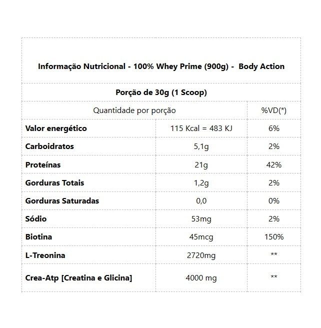 100% Whey Prime (900g) - Ação Corporal Para você que gosta de treinar mas tem dificuldade de ganhar massa muscular, chegou o 100% Whey Prime, desenvolvido com Whey Concentrado, obtido através de um processo de ultrafiltração. Suas fórmulas exclusivas CREA-ATP e T-BIOTINE irão aumentar seu ganho de massa muscular! Evolua com o 100% Whey Prime da Body Action. Benefícios: * Auxilia no ganho de força e nos níveis de energia durante os treinos; * Potencializa os níveis de energia através do transporte de oxigênio no sangue; * Ajuda a diminuir dores, faça com que os treinos sejam mais intensos e melhorem os ganhos de massa muscular; * Atua diretamente na produção de elastina no tecido muscular.