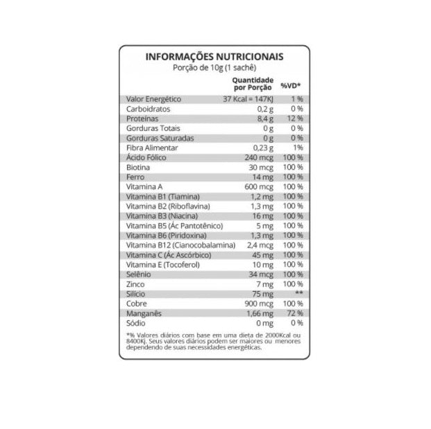 Colágeno Hidrolisado 2 em 1 (30 Sachês de 10g) - MaxiNutri Colágeno hidrolisado 2 em 1 Maxinutri é um suplemento em sachês por alto teor de peptídeos de Colágeno Peptan®, além de Vitaminas A, B, C, E e Minerais como Zinco e Silício, além de ser adoçado com Stévia, de grande importância para diabéticos e em dieta. O Colágeno é uma proteína muito importante no organismo, visto que faz parte da estruturas de várias células, em especial a pele. Ele provê hidratação, firmeza e elasticidade, deixando com aspecto jovial. Sabemos que por volta dos 25 a 30 anos há uma diminuição das produções de colágeno pelo organismo, onde há o aparecimento de rugas e linhas de expressão, sendo assim necessário sua suplementação. O consumo do Colágeno é interessante, uma vez que ajuda a minimizar os efeitos do envelhecimento, minimizando rugas, deixando cabelo e as unhas mais fortes, amenizando estrias e celulites. Outro ponto a ser relatado é que o Colágeno por estar na forma Hidrolisada, permite maior absorção o e assim consequentemente o corpo aproveitar melhor seus benefícios. Por fim, por possuir Vitaminas e Minerais em alta concentração, os quais são poderosos antioxidantes, combatem os malefícios dos radicais livres, como o envelhecimento precoce da pele. Benefícios:* Alto teor de Colágeno 9g por porção;* Saúde de Pele, Cabelo e Unhas;* Rico em Vitaminas e Minerais.