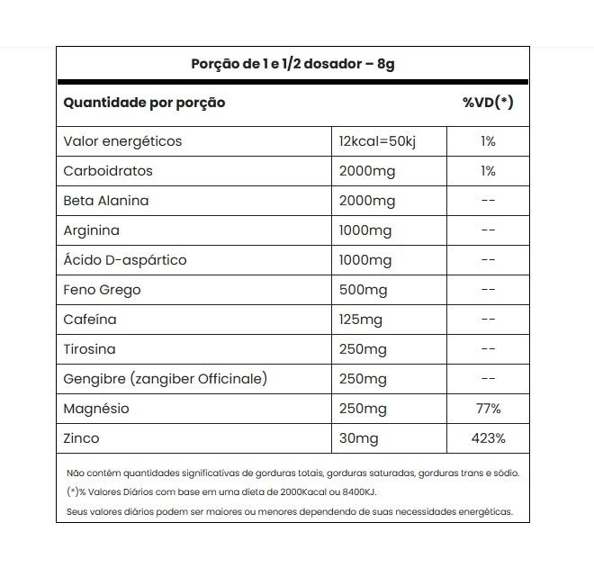 Test On (240g) Test On: Potencialize sua performance com o precursor de testosterona mais avançado do mercado. Test On é um precursor de testosterona especialmente formulado para impulsionar o desempenho físico, aumentar a resistência e fortalecer os músculos. Com uma composição única de ingredientes criteriosamente selecionados, Test On visa estimular naturalmente a produção de testosterona no corpo, promovendo melhorias notáveis nos resultados. A Beta alanina, convertida em carnosina, reduz a fadiga muscular, melhorando resistência durante o treinamento. A Arginina melhora a circulação, aumentando a entrega de oxigênio e nutrientes aos músculos, e o Ácido D-aspartico estimula a produção de testosterona. O Feno Grego melhora força e resistência muscular, a Cafeína aumenta energia e concentração. A Tirosina melhora desempenho mental e físico, e o Gengibre, com propriedades anti-inflamatórias, reduz a dor muscular pós-treino e estimula a produção de testosterona. O Magnésio e Zinco são minerais essenciais para a produção de testosterona e a saúde muscular. Juntos, promovem o aumento de massa muscular magra, força e resistência, auxiliando atletas a alcançar seus objetivos de treinamento de maneira eficiente. Test On é uma opção natural e eficaz para aprimorar os resultados físicos. Com uma fórmula única de ingredientes comprovados, ele impulsiona a produção de testosterona, melhora resistência e força muscular, e diminui a fadiga durante o treinamento, possibilitando alcançar objetivos de forma rápida e eficiente. Benefícios: - Precursor de Testosterona;- Aumento de Energia e Disposição;- Melhora do Foco;- Auxilia no ganho de Massa Magra.