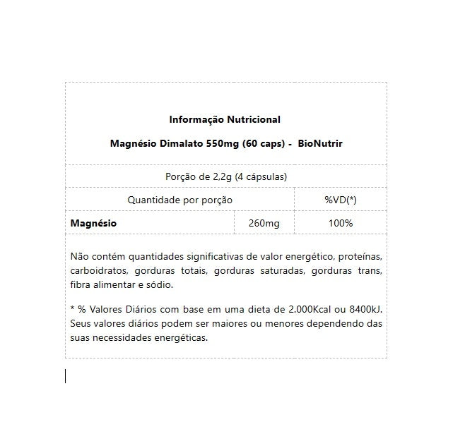Magnésio Dimalato 550mg (60 caps) - BioNutrir O Magnésio Dimalato é essencial para o funcionamento saudável do corpo, ele é basicamente composto por ácido málico e magnésio, substâncias que em conjunto atuam como operários de nossa saúde! O magnésio atua no cerne da vida humana, como condutor e regulador. O Acído málico é um composto orgânico natural, encontrado em alimentos como Maçã e Pêra. Entre suas muitas funções, podemos elencar por exemplo, a capacidade de auxiliar de maneira central, a produção de energia no organismo, como veremos a seguir! Um componente tão importante em nossas vidas, muitas vezes é deficitário na maioria das dietas. Muitas vezes não consumimos diariamente alimentos e nutrientes que compõe nossa dosagem mínima de Magnésio. Por outro lado, também podemos eliminá-lo de nosso corpo por patologias, ou até mesmo por estresse. O Magnésio Dimalato pode, e deve ser suplementado para promover o bem-estar do nosso corpo de forma mais abrangente. Sua aplicação atinge importantes níveis de preenchimento em necessidades básicas para a preservação e cuidado a vida, para uma melhor disposição cotidiana, desde o controle de crescimento ósseo, produção energética, e de óxido nítrico. O Ministério da Saúde recomenda uma dosagem diária de 260mg de magnésio. É justamente essa dosagem de 260mg que o Magnésio Dimalato da Bionutrir lhe oferece em cada porção! Benefícios: * Auxilia o relaxamento e contração dos músculos;* Cuidado e manutenção da saúde cardiovascular;* Crescimento da absorção de cálcio na dieta;* Atua no combate e prevenção da fadiga muscular;* Responsável importante na quebra e construção de compostos orgânicos em nosso processo metabólico;* Melhora a qualidade do sono, reduzindo intermitências e insônia;* Sua atuação na área de impulsos nervosos contribui para a manutenção do funcionamento adequado da atividade cerebral;* Atua principalmente na regulação, equilíbrio e manutenção do funcionamento correto e saudável do corpo humano, em diversos ciclos de exercício.