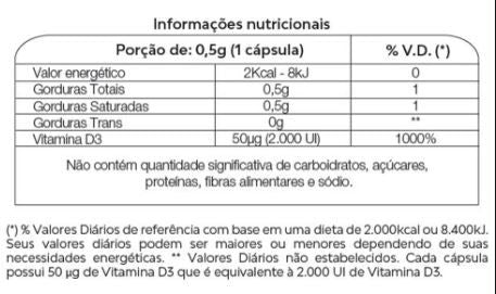 VITAMINA D (60 caps) - VITAFOR A vitamina D3 é um hormônio esteroide lipossolúvel essencial para o corpo humano e sua ausência pode proporcionar uma série de complicações, afinal, ela controla 270 genes, inclusive células do sistema cardiovascular. Ela pode ser ingerida tanto pelas suas fontes naturais, exposição solar e alimentação, quanto por suplementação. BENEFÍCIOS * Auxilia na formação de ossos e dentes;* Auxilia na absorção de cálcio e fósforo e na manutenção de níveis de cálcio no sangue;* Auxilia no funcionamento do sistema imune e muscular;* Auxilia no processo de divisão celular;* Alta concentração de Vitamina D3 por cápsula – 2.000UI por cápsula de 500mg;* Indicado para maiores de 9 anos de idade;* Livre de corantes artificiais;* Livre de alergênicos;* Com TCM (Triglicerídeos de cadeia média) como veículo. Embalagem disponível: pote contendo 60 cápsulas de suplemento.