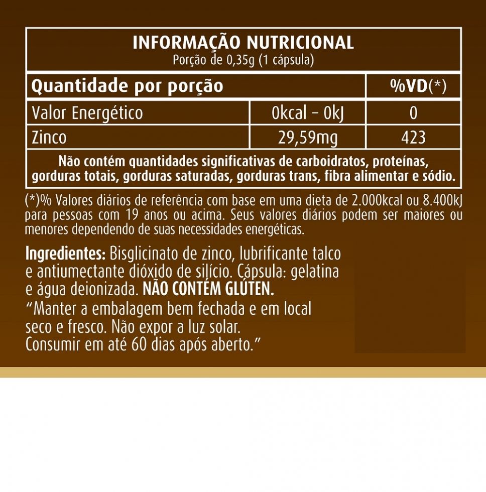 Zinco (60 caps) - Apisnutri O Zinco da Apisnutri é um mineral indispensável para o sistema imunológico, pois é um poderoso antioxidante e participa do metabolismo celular de DNA´s, proteínas, carboidratos e lipídios. O Zinco é essencial na formação do tecido ósseo, dentes e principalmente na contratilidade muscular, síntese hormonal e absorção de outros minerais, além de possuir diversas indicações como crescimento e reprodução celular; maturação sexual; fertilidade e reprodução; melhora do paladar; acelera a cicatrização de feridas e queimaduras, entre outras. Benefícios:* Antioxidante;* Previne o envelhecimento precoce;* Participa da construção e degradação de proteínas, carboidratos e gorduras com ação antioxidante sobre as células;* Melhora a absorção de outros nutrientes e minerais;* Fortalece o sistema imunológico;* Auxilia na síntese de hormônios esteroidais. Embalagem disponível: frasco contendo 60 cápsulas.